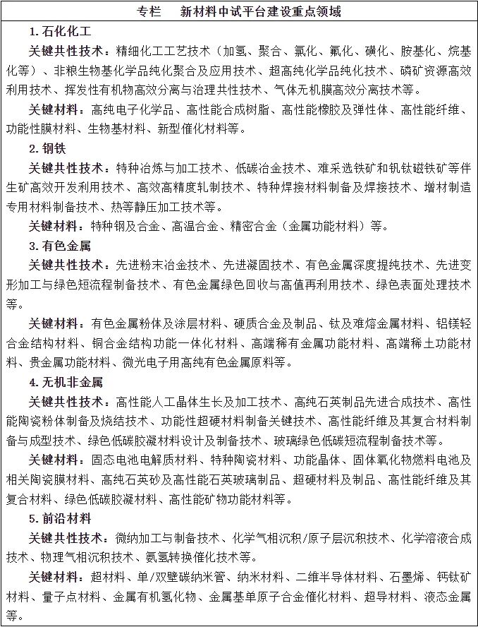 围绕加快推进新型工业化、建设制造强国战略需求,着眼事关国家安全和经济建设的关键短板材料、引领新兴产业和未来产业发展的前沿材料,聚焦“触类旁通”效应明显、行业进步带动性强的关键共性技术,确定新材料中试平台建设的重点领域。